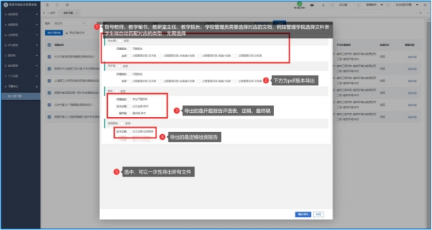 学生/教师用户按下图方式导出以下材料:各角色登陆系统之后,点击下载中心,选择需要下载的学生数据,点击导出列表文件-点击“导出选中”或“导出全部”选择需要下载的过程文件。
