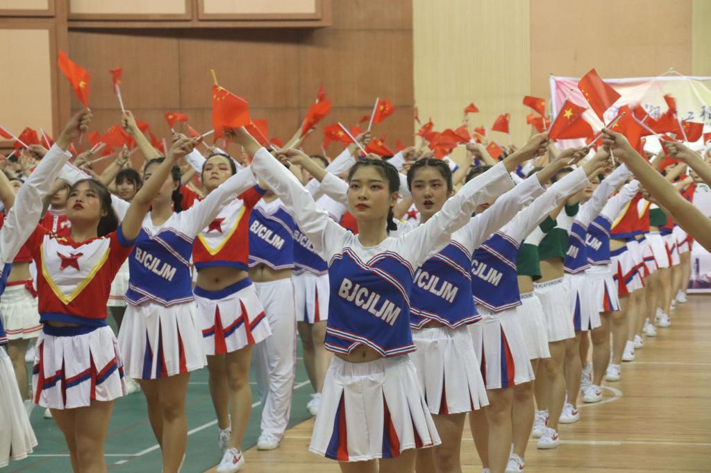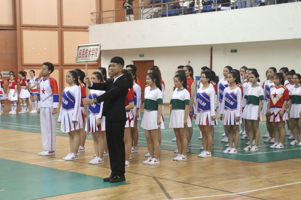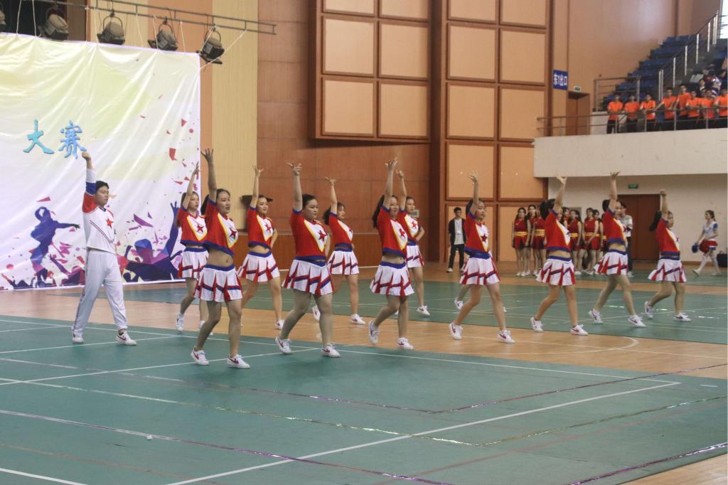 本次比赛共四个环节,各学院组成的十一支队伍参赛,按次序依次进场。beat365官网代表队第八个入场,“应院加油”的口号响彻全场,选手们明快奔放的动作,鲜明的节奏感向大家展现了青春的激情,赢得了在场观众的热烈掌声和喝彩声。随后,beat365唯一官网体育教学部周教授致开幕词。伴随着《我和我的祖国》的音乐响起,所有参赛队员挥舞着手中的小红旗,整齐划一的动作挥洒出青春的风采;各学院代表组成的队伍跳起欢快激情的藏族舞蹈,为祖国七十华诞献礼。