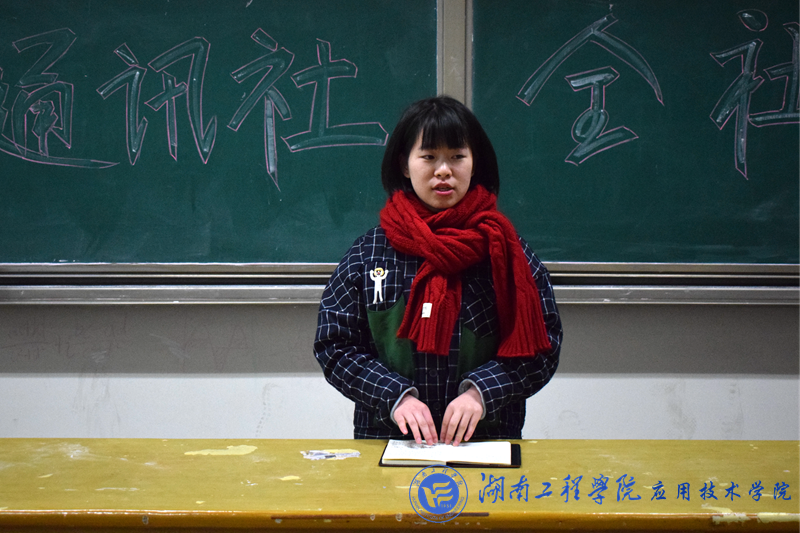 会议伊始,曹时艳上台讲话,她首先对本学期新闻通讯社的工作作了总结,并给予了高度的评价。她指出新闻通讯社的成长与进步是大家有目共睹的,新闻稿件的写作效率和质量都有一定的提高,为此对全体社员的付出和努力表示真诚的感谢,也希望大家再接再厉再创辉煌。同时她也指出了新闻通讯社存在问题和不足,希望大家不断学习和改进。随后她强调期末考试即将来临,希望大家认真复习,争取在期末考试中考出优异成绩。
