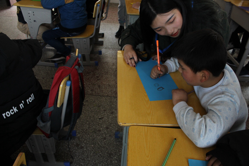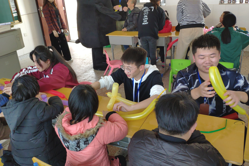 活动开始,志愿者与小朋友们一起画画、捏气球、进行手工制作。在志愿者们耐心的引导与鼓舞下,小朋友们迅速的活跃起来,满怀笑容的向志愿者们展示他们的手工成果,教室里笑声不断。一旁的老师们都感叹道“他们能这么快的与志愿者们熟悉起来真是不常见!”