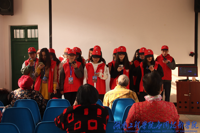 下午14:00,志愿者准时在校门口集合出发,怀着兴奋激动的心情踏上了去敬老院的道路。刚到达敬老院门口就有眼尖的老人看见了志愿者团队,老人们开心的呼喊着志愿者们的名字,老人们的热情是让志愿者们感到更加开心。志愿者们随老人们进入了院里,按照事先的安排为老人进行了节目表演,歌曲《军中绿花》、舞蹈表演赢得了老人们阵阵掌声,之后志愿者曾彪带来的花鼓戏《补锅》更是逗得老人们哈哈大笑。