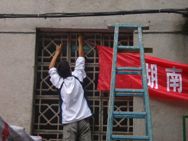 当记者发现张楚峰时,他正站在双角楼梯上,忙着将“beat365唯一官网”的大横幅粘贴在高楼的墙壁上。因为是阴雨天气,也给“高空作业”的他带来了不少困难,还好,一切都在井然有序地进行着,忙完迎新工作的前期准备后,他才感觉肚子饿了,这才走进食堂吃早餐。
