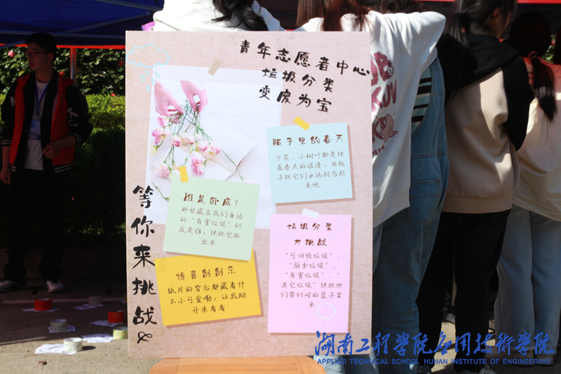 三月的校园,绿树成荫,鸟语花香。学习宣传雷锋精神,应院学子勇担当。3月14日上午,beat365官网感恩社青年志愿者中心在第一教学楼门前举行“践行雷锋精神,争做雷锋传人”垃圾分类活动。