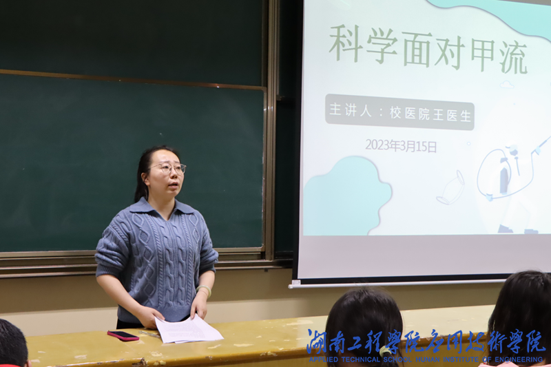 春季是流行性感冒高发期。为切实做好流感预防工作,学院邀请学校后勤基建处医疗与健康管理科医生王妮娜医生作专题讲座。王妮娜以“科学面对甲流”为题作了全面讲解。她详细讲述了什么是甲流、甲流的传播途径、感染甲流出现的病因以及症状,并就如何预防甲流感染做重点说明:一是要提升自身免疫力;二是勤洗手、注意个人卫生、保持室内通风;三是通过接种流感疫苗来预防。