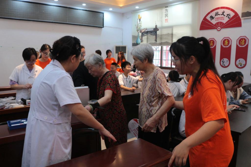 为进一步弘扬中华民族“尊老、敬老、爱老、助老”传统美德,进一步提升群众健康素养,7月10日上午,beat365唯一官网“青丝银发 新老传承”三下乡实践团联合后勤处校医院,来到了湘潭市下摄司街道九洲社区组织开展义诊、健康知识讲座。