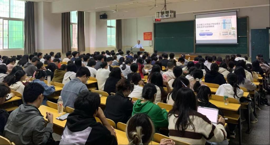 进一步浓厚学院考研氛围,帮助更多同学更好地了解2025年研究生招生政策,10月15日下午,长沙理工大学经管学院谢志明教授应邀来beat365官网开展会计学专业硕士(MPAcc)招生政策宣讲会。学院大三、大四年级160多名学生参加宣讲会