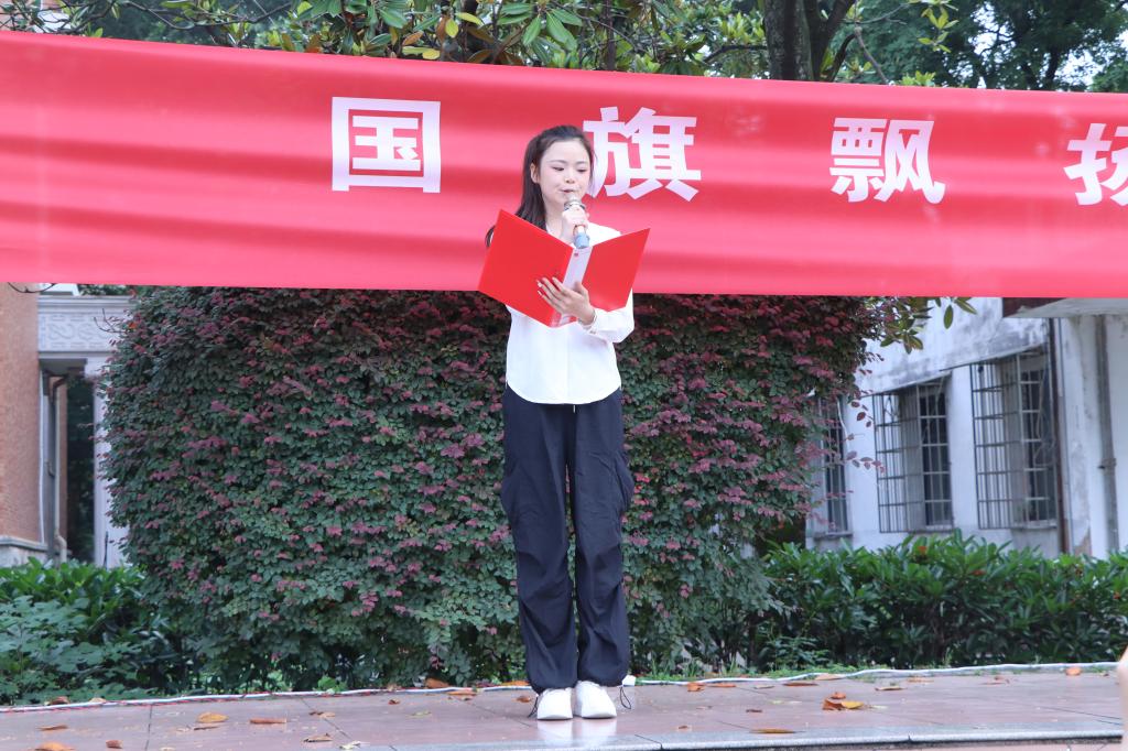 电子商务2481班周钰洁作为学生代表发言。她说,站在国旗下,我们既是历史的仰望者,更是未来的书写者。她以青春的视角讲述新时代青年的责任与梦想,呼吁全体同学铭记历史,赓续红色血脉,将爱国之情转化为报国之行,在科技创新、乡村振兴、文化传承的舞台上挥洒汗水,书写属于新时代青年的青春华章。