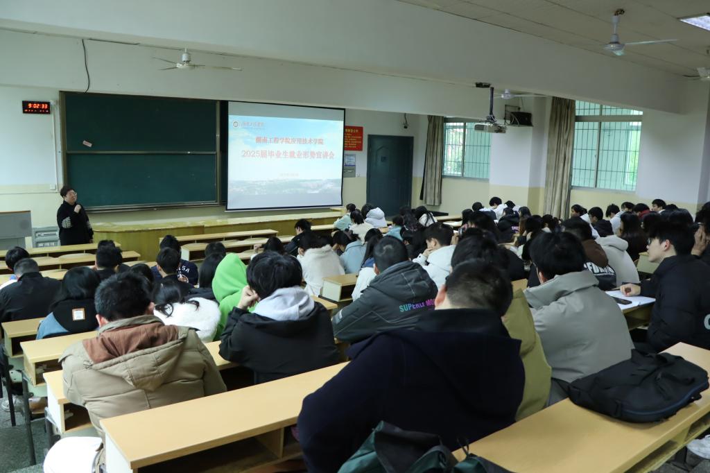 3月3日上午,beat365官网2025届毕业生就业形势宣讲会在第一教学楼213教室召开,学院招生就业办公室主任谢丽娟主讲2025届毕业生参加。
