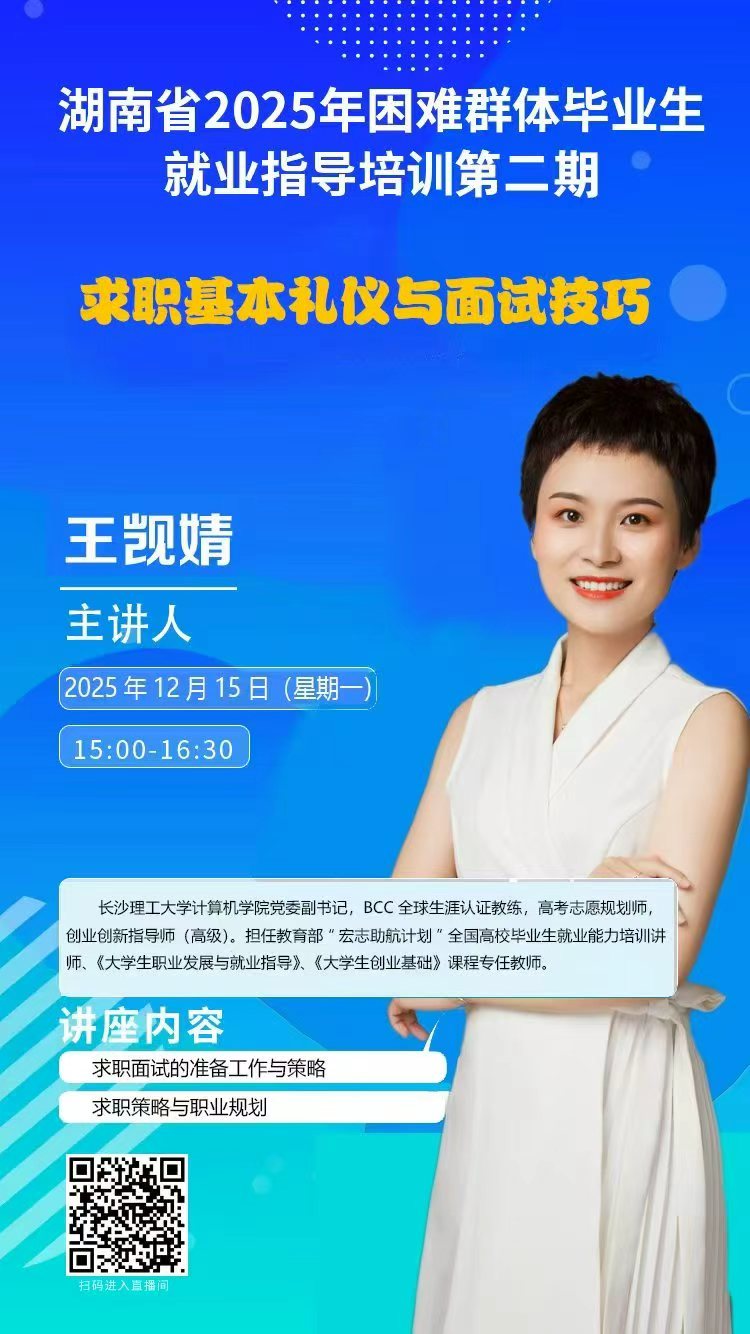 湖南省 2025 年困难群体毕业生就业指导培训(第二期)”第一场于12月15日(下午)15:00—16:30开展