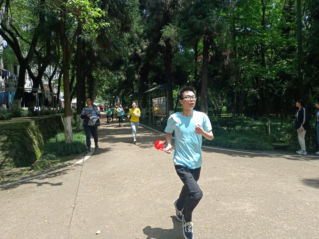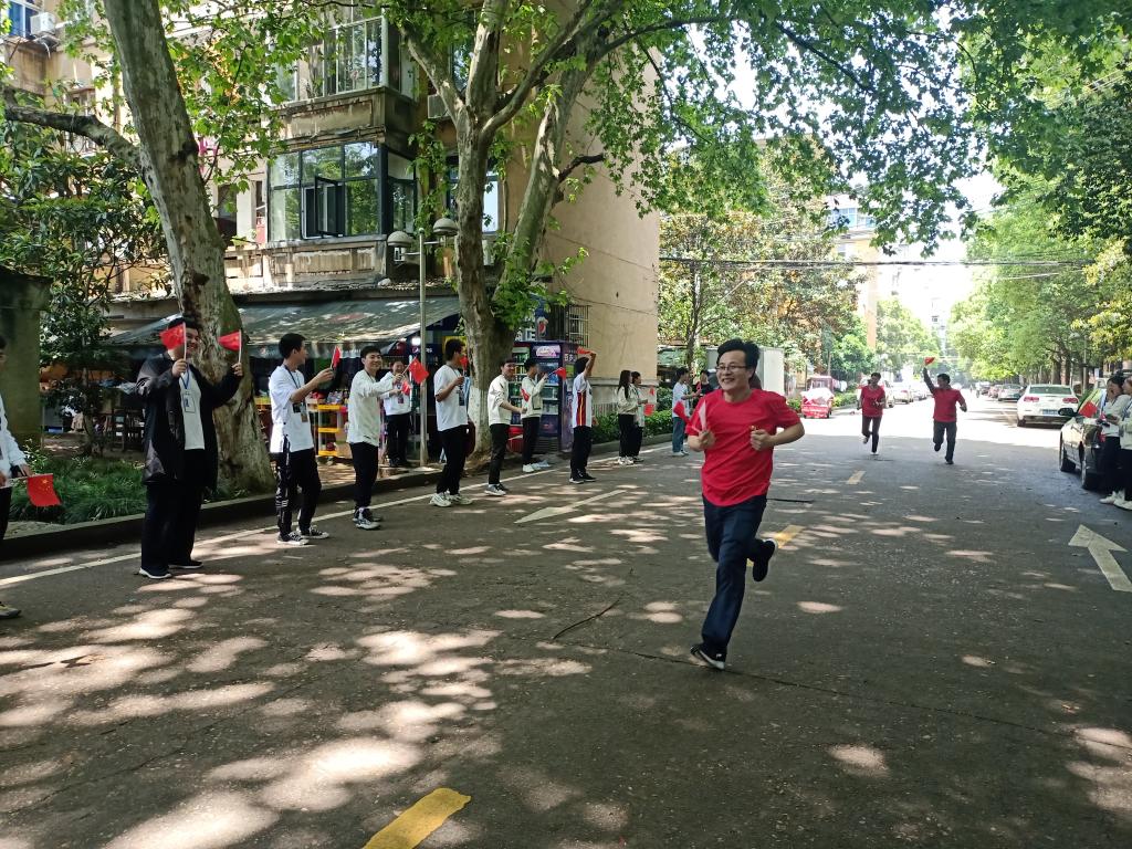 “再加把劲儿,冲啊!”在打卡点,先到的运动员大声为后面的队员加油鼓劲,队员到齐后,他们相互拥抱,欢呼雀跃,拿着红旗与宣传板合影拍照,咔嚓声落下,下一棒运动员又像离弦之箭冲了出去。交棒、接棒、等待、集合、打卡拍照,每个环节都分秒必争,运动员们的衣服被汗水浸湿,累得气喘吁吁,但他们的脚步并未停歇。“加油,我们快到最后一个打卡点了,准备冲刺!”第六党支部的学生党员杨娟鼓励身边的队友,他们卯足了劲一鼓作气冲向终点。“第一名!”欢呼声、尖叫声、鼓掌声此起彼伏,整个校园都沸腾了起来。“想当年革命先烈冒着枪林弹雨冲锋陷阵,我们现在能在阳光下奔跑,是多么的幸福和来之不易。正是因为有长征精神的鼓舞,我和同学们才能坚持跑完全程,并且取得了不错的成绩。”杨娟说,她红彤彤的脸上洋溢着灿烂的笑容。