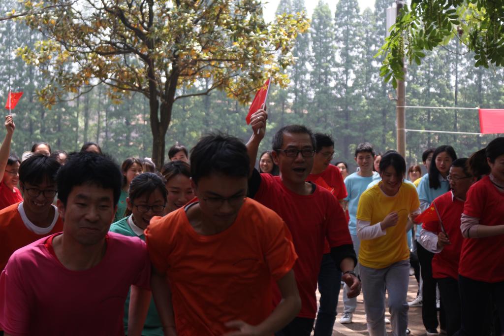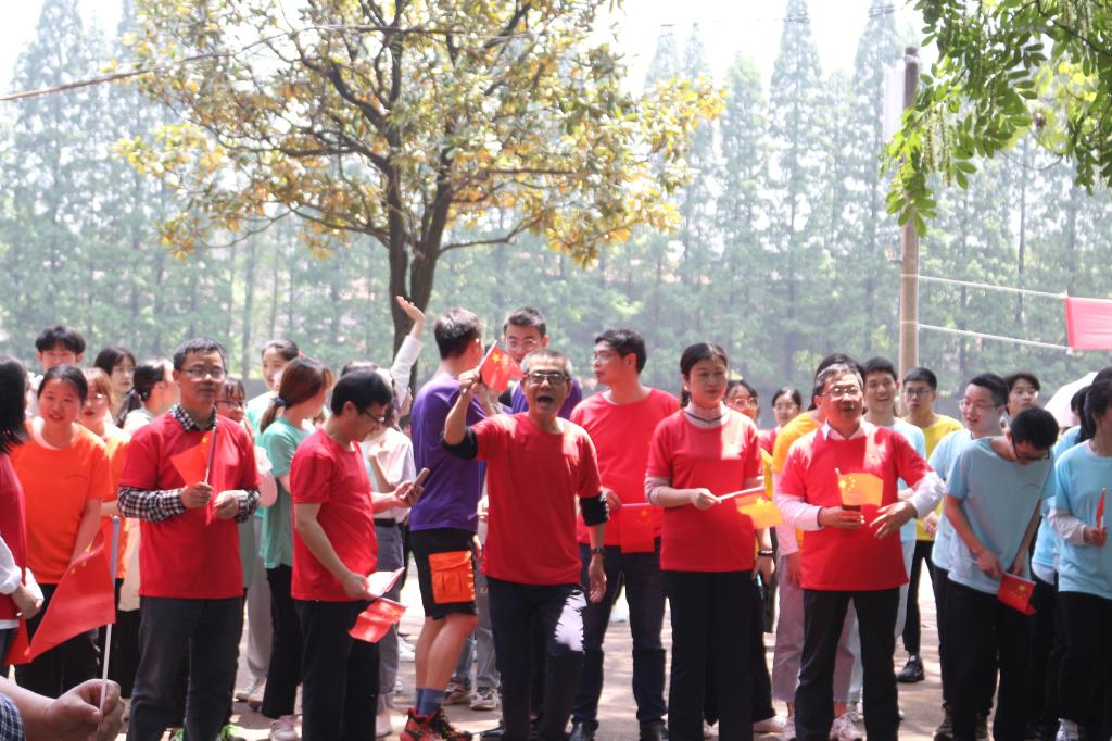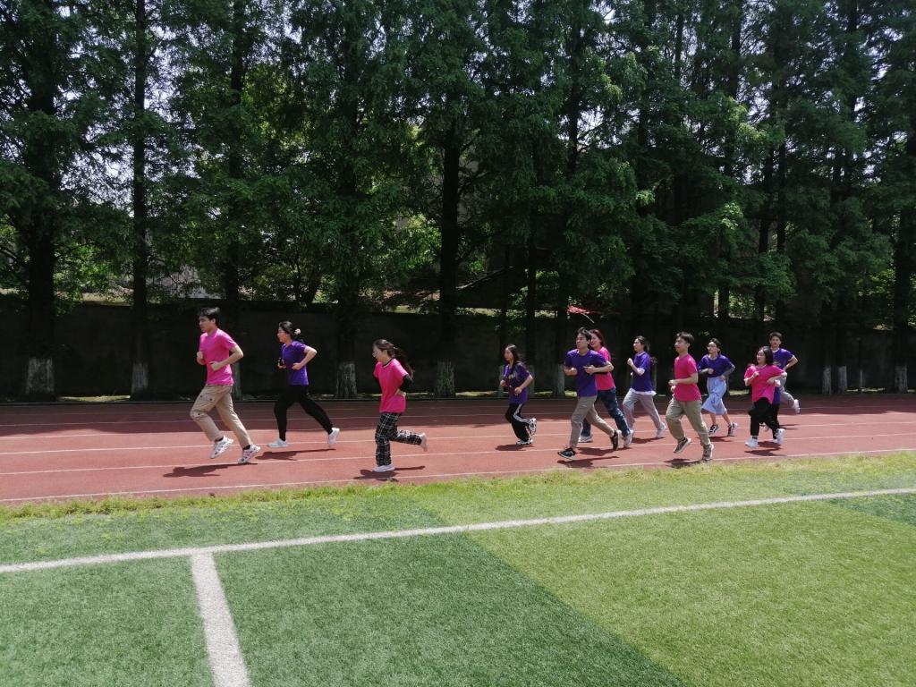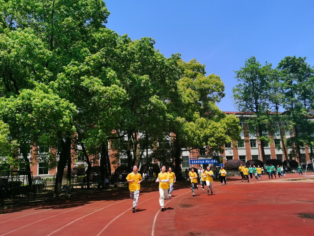 “加油!加油!”操场上传来一阵阵震耳欲聋的呼喊声,一声令下,接力赛第一棒运动员冲出起跑线。田径场上空回荡着激昂澎湃的爱国歌曲,赛道上,参赛者你追我赶,奋勇争先。学生们分别穿着紫、蓝、粉红、黄、绿、橙六种颜色的服装,教师们穿着正红色服装,七种色彩奔跑在草木葱茏的校园内,充满活力的身影成为了一道道绚烂的彩虹。