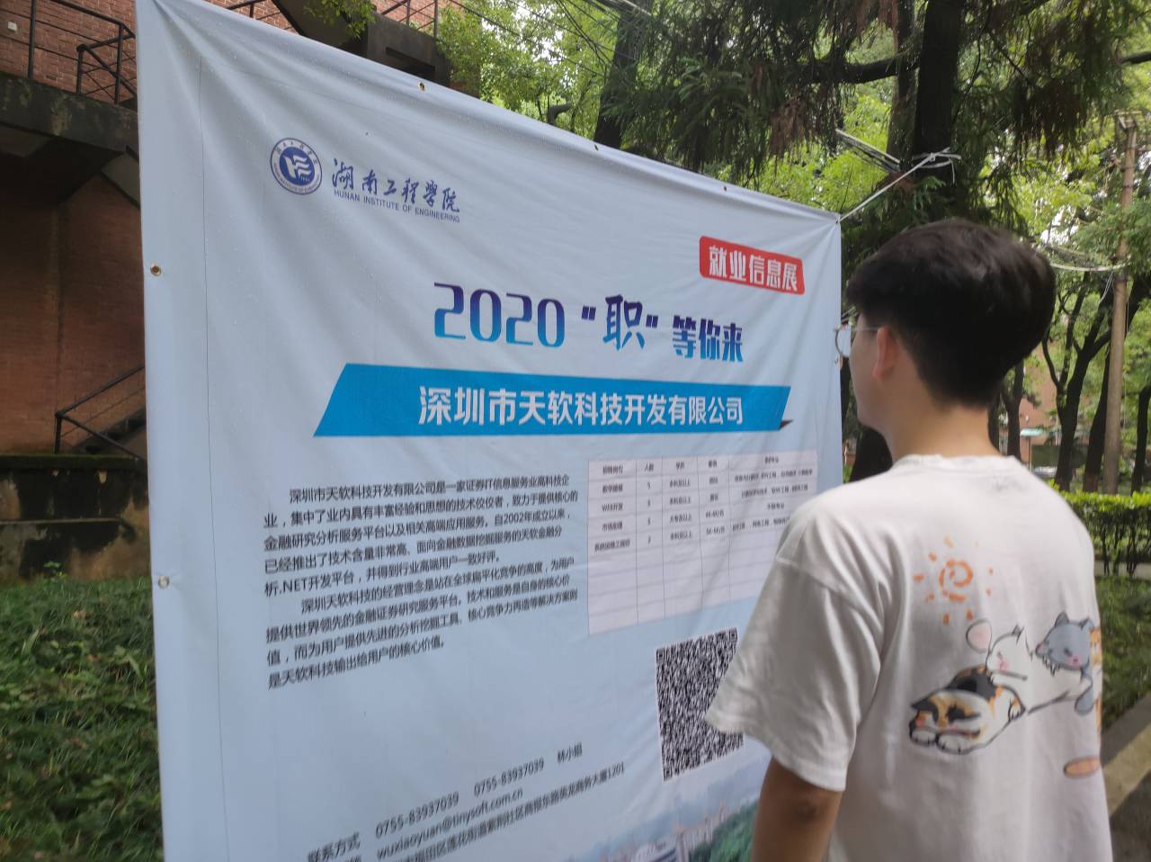 毕业生离校在线招聘会将于6月8日开启,就业信息展汇正在进行。本次就业信息展汇集了学校招就处、校友办公室、学院自己联系的重点企业60家,共1000余个岗位,涵盖了beat365唯一官网所有专业。布展充分利用南校区校园大树成荫、间距合理的优势,在学生宿舍、食堂前以及两者的必经通道两旁,通过大幅海报的对招聘企业的基本概况、招聘岗位、薪资水平等信息进行介绍,吸引了不少毕业生驻足查看,扫码投递简历。