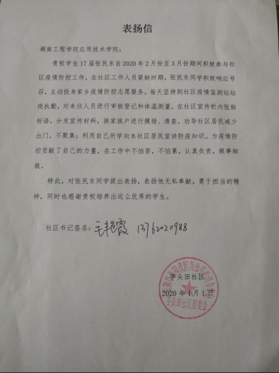 工商管理1782班张民东同学,积极响应号召参加当地社区疫情防控志愿服务,在社区疫情监测站站岗执勤,“在工作中不怕苦,不怕累,认真负责,做事细致”。