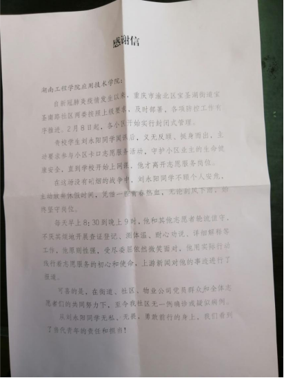 机械设计1781班刘永阳同学,疫情期间主动要求参与当地小区卡口志愿服务活动,“他和其他志愿者轮流值守,不厌其烦地开展查证登记、测体温、耐心劝说、详细解释等工作,他原则性强,受尽委屈依然微笑面对,他用实际行动践行着志愿服务的初心和使命。”
