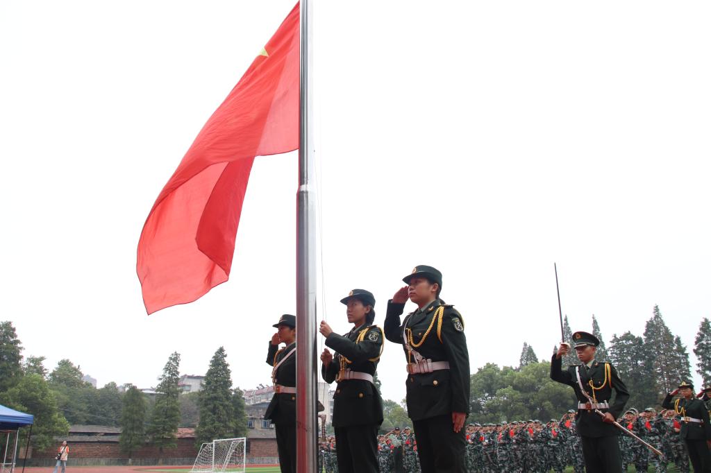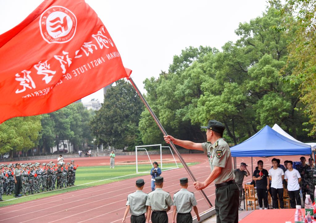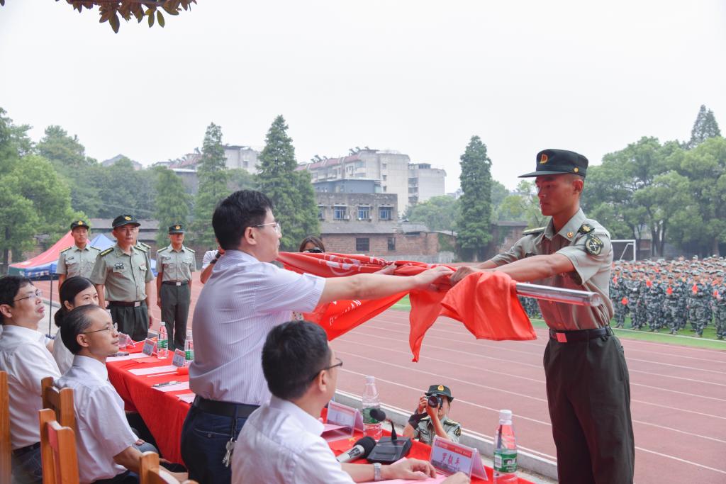 随后成平下达2019年新生军训任务。军训团教官代表贾小龙发言,作为教官会以身作则,树立良好形象;加强沟通,了解学员思想情况;科学施训,树立服务意识,确保军训任务的高标准、高质量完成。参训新生代表、会计学1981班廖垠同学发言,表示新生们要充分认识军训的重要意义,用高标准、严要求规范自己,不怕困难,刻苦训练,服从命令,听从指挥,圆满完成军训任务。最后,易兵为军训团授旗。成平郑重地从易兵手中接过军训团团旗。