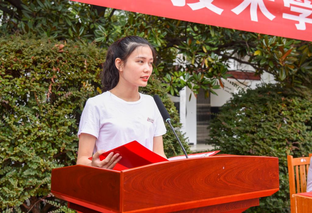 在校学生代表、工商管理1781班刘倪萍发言,她结合个人大学经历,强调在大学要以学习为主旋律,要敢于尝试,在学校搭建的平台上、在社会实践中展示自我、锻炼自我,挑战自我。