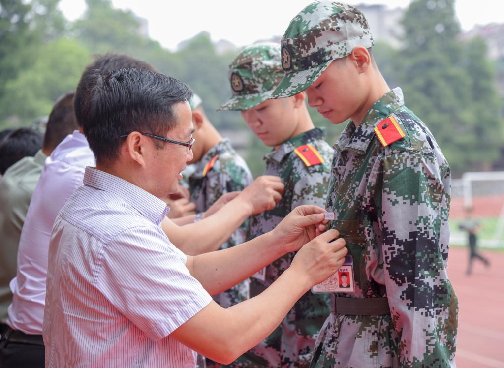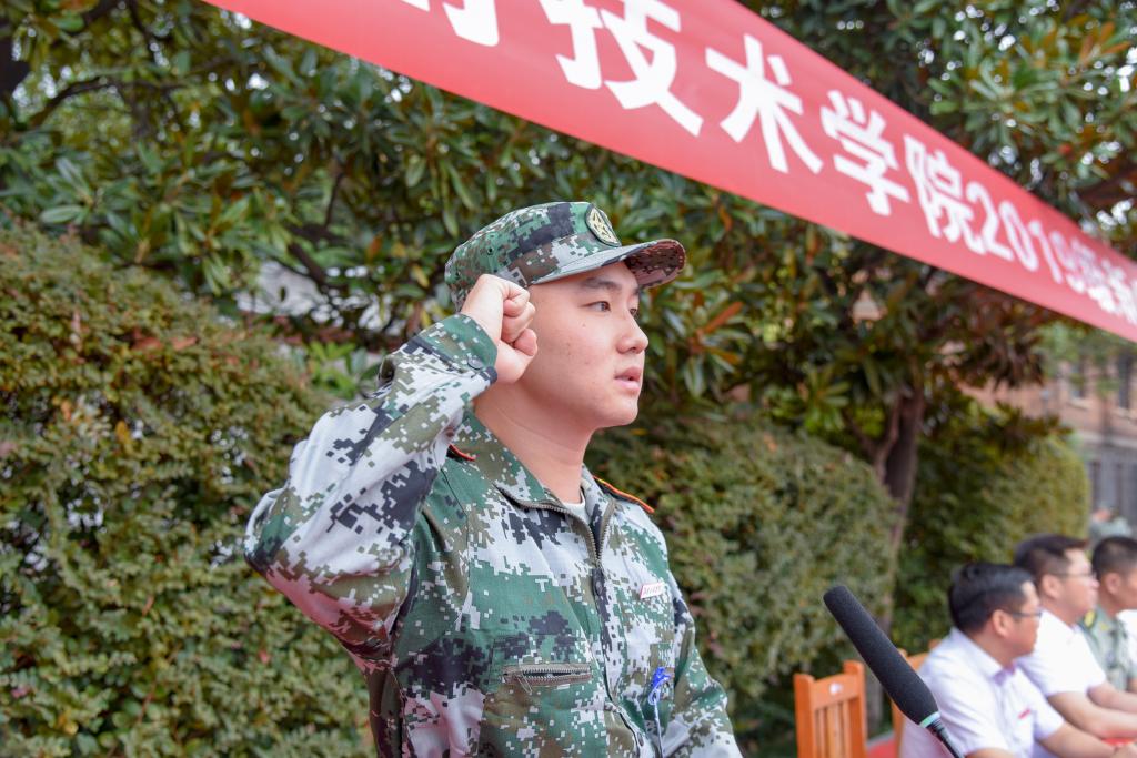 现场领导为新生代表佩戴校徽,全体新生佩戴校徽。其后,全体新生进行入学宣誓,经济学1982班龙贺君同学领誓:牢记“锲而不舍,敢为人先”的校训,胸怀祖国, 忠于人民......”铿锵的誓言响彻操场上空,蕴含着青春无限的力量。