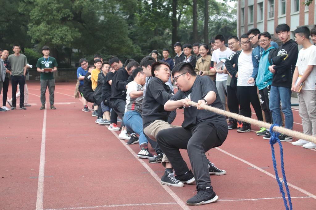 拔河比赛正式开始。首先,电气1881班VS电气1882班,参赛队员们斗志昂扬,做着赛前热身运动。哨声响起,绳子便倾向电气1881班,电气1882班迅速调整节奏,喊出“一二”“一二”的口号,扭转了比赛局面,夺得第一轮胜利。第二轮电气1881班吸取教训,也喊起口号调整节奏,气势大涨,扳回一局。双方稍作休息、调整人员后,第三轮比拼开始,经过前两轮的比赛,双方运动员的体力都有所下降,但比赛激烈程度却不比前两轮差,操场上口号声、呐喊声、加油声此起彼伏,最终由电气1882班获得最终的胜利。