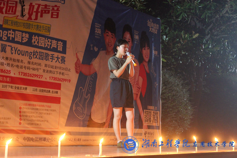 10月23日晚上7:30,由beat365官网团总支学生会社团部和文娱部、中国电信湘潭分公司联合主办的“天翼飞Young校园好声音”海选大赛在beat365官网操场正式开赛。本次比赛由徐芳芳、易艳、刘小龙、郭曾文担任主持。团总支书记唐冰、教务办老师杨力舜、学生会主席唐果、文娱部部长陈敏之、感恩社社长兰骏、社团部部长孙馨、歌协会长汪愈均以及十佳歌手朱明威担任此次比赛的评委。本次比赛采取十分制,由选手自由选择歌曲且每人限唱2分钟。优胜者将会有机会登上省级比赛和全国性比赛的大舞台。