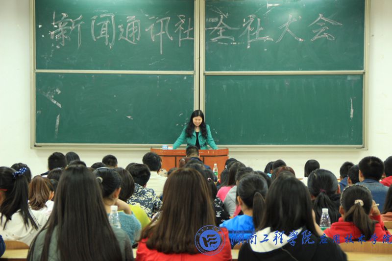 蒋慧筠老师在会上讲话。她认为,新社员首先要明确目标,我们为何而来,能收获什么?其次要正确处理学习与工作的关系,并强调学生要以学业为重,要在学习中收获,在锻炼中成长。最后,她强调做一名合格的校园记者,要随时待命、积极对待每一份工作。她希望全体社员要努力提高新闻通讯社的知名度。