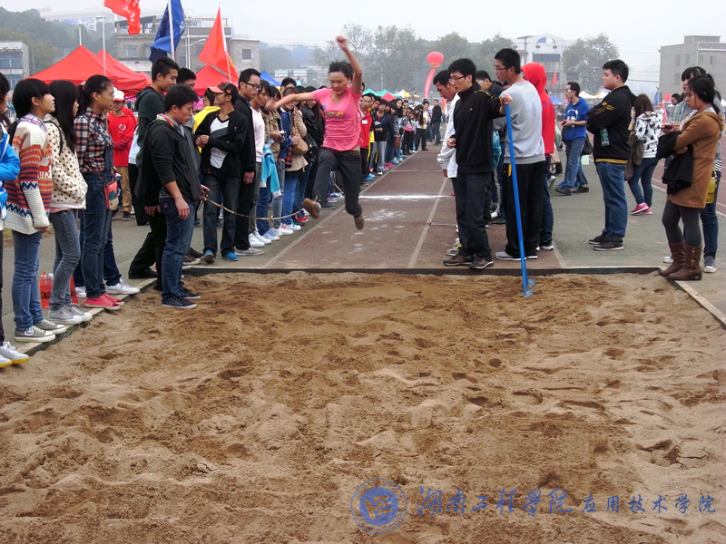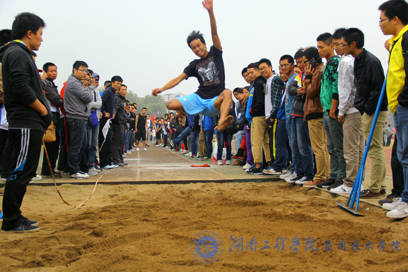 来自各个学院的女中豪杰率先在这片热情的“沙漠”上完成她们的跳远比赛。双眼紧盯前方,深呼吸,助跑,纵身起跳,平时看似纤弱的女生,急剧助跑后,纵身一跃,继而双脚深深地嵌入松软的“沙漠”里。