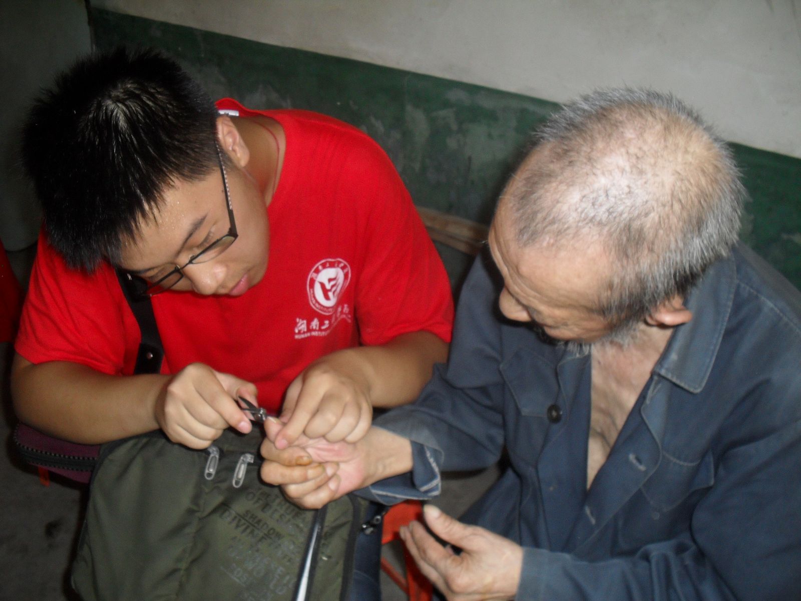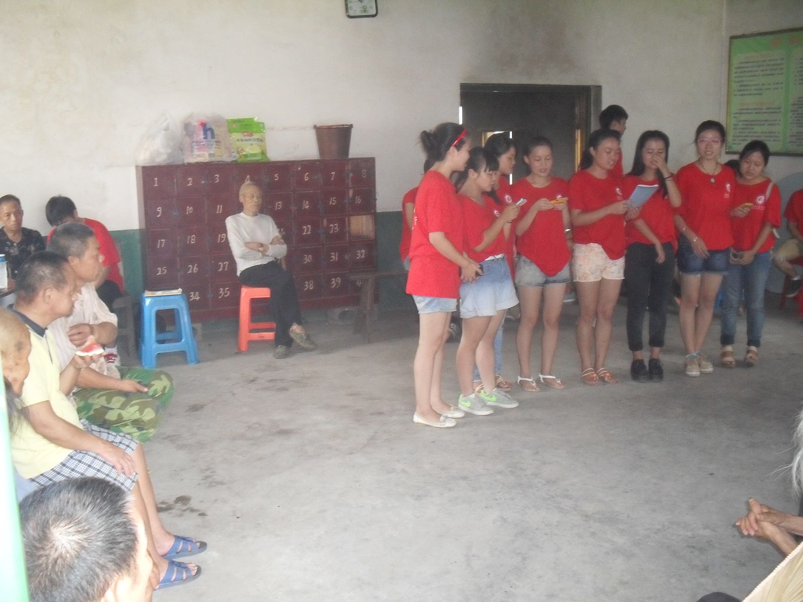 云湖桥第一敬老院共住有40余位老人,他们基本上属于没有了儿女、或身有残疾、房屋倒塌、无处居住的“五保”老人。在院长的带领下,我们和老人们进行了互动和交流,对老人们的情况作了大致的了解:他们都是孤寡老人,所以在生活常常相互照顾。志愿服务团的成员有的扶着老人在院子里散散步、谈谈心,有的为老人剪指甲、扇风,老人们的脸上洋溢着满意的微笑。服务团给老人们带来了文艺节目,其中女生们合唱《感恩的心》,感恩父母、感恩老师、感恩朋友、感恩社会,大家都深深地被感动;服务团和老人们一起合唱《打靶归来》、《团结就是力量》等革命歌曲更是让老人们开怀大笑,连连鼓掌;一曲《母亲》将演出推向了高潮,老人们和着节拍跟着吟唱,唱出了母爱的伟大……