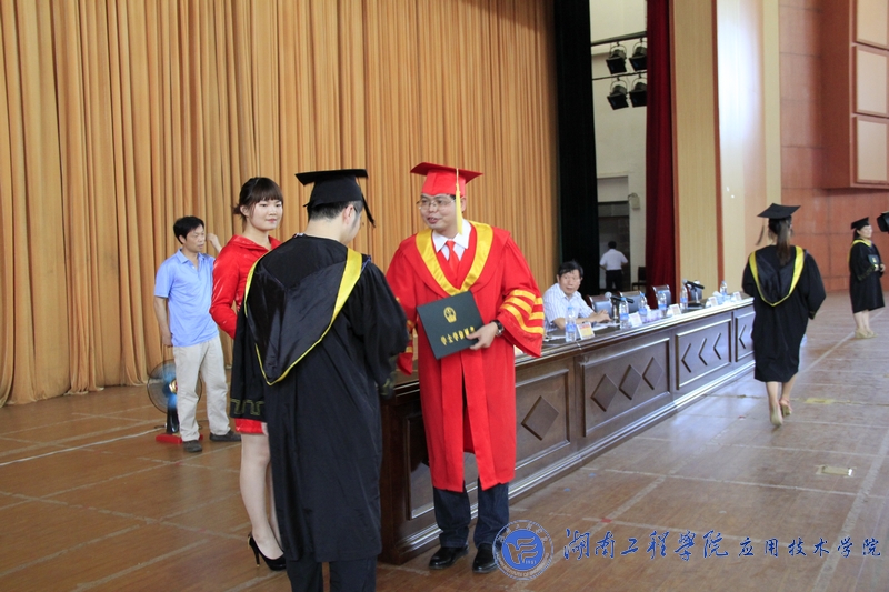在主席台就坐的领导为毕业生颁发了毕业证,李光中院长为毕业生代表拨帽檐流苏、授予学位证书。