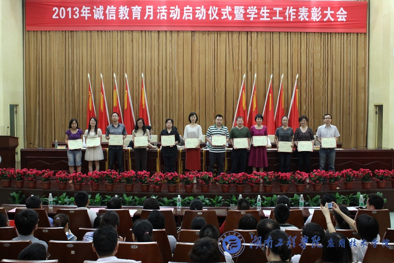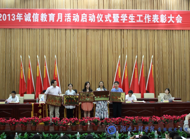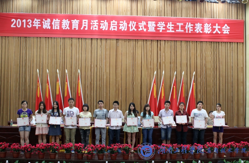 5月14日下午3点,我校2013年诚信教育月活动暨学生工作表彰大会在图书馆第一报告厅盛大举行。校党委书记谢伯端、副校长李希恒、团委书记黄中华、学生工作处处长刘涛、副处长胡国骏、黎娅及各学院学办老师、辅导员、班主任、获奖学生等优秀代表参加了本次大会。