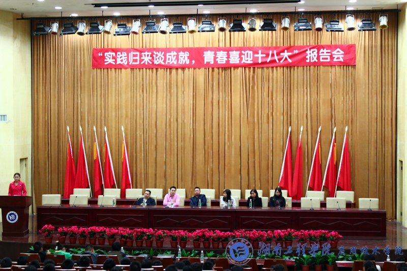 报告会中,优秀学生代表物流0982班张垄水、经济学0981班肖超、通信0981班李威、服设0981班谢爽、人力1082班安雨、人力1082班黄雄伟一一上台发表演讲,他们分别以三下乡、教官选拔、感恩社的创立、社会实践、党员干部、社会繁荣发展、党的发展几个方面发言,朴实而又振奋人心的演讲内容突出了“实践归来谈成就,青春喜迎十八大”的主题,最后,刘红石作大会总结,一是肯定了以上优秀学生代表的发言;二是寄予了学生的期望并预祝党的十八大取得圆满成功。