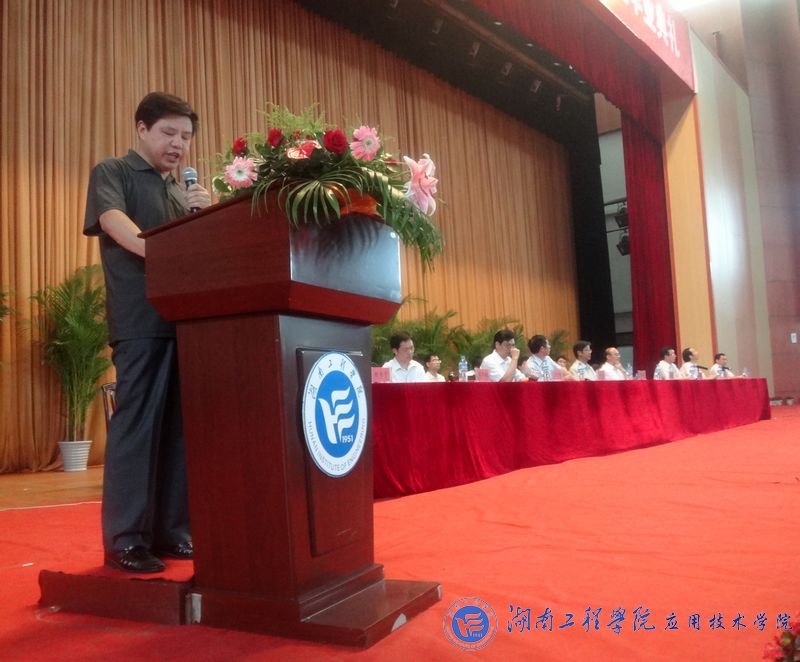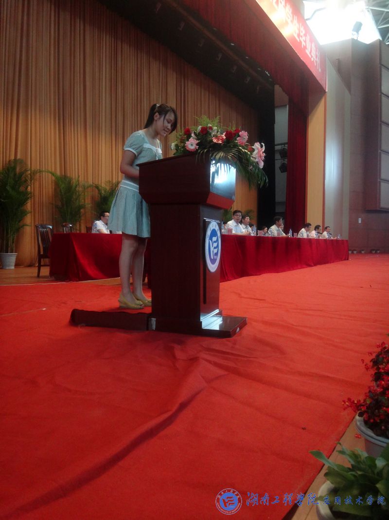 典礼在庄严的国歌中声拉开序幕。在热烈掌声中,刘国荣深情致辞。他首先向学业有成,即将告别母校,踏上人生征途的毕业生表示感谢,感谢他们把四年最美好的青春留在湖工;向默默奉献的教师们表示感谢,感谢他们让同学们更好的成长成才。接着,他勉励大家在人生的崭新航程中,要“笃学求新,自强不息”,不断学习和历练,全面挖掘自身的潜能。刘国荣希望全体毕业生继续发扬湖工人“踏实做事,不事张扬”的作风,牢记“细节决定成败”,从大处立志,从小事着手,从自身做起,从身边事做起,脚踏实地,严谨务实,志存高远,精心描绘好未来的人生蓝图。他希望即将毕业的学子们在工作生活中继续弘扬湖工“锲而不舍,敢为人先”的精神,展现湖工精神,同时提醒学子们在以后工作忙碌之时要常回家看看,重拾美好的回忆。最后,刘国荣表达了对毕业生的热烈祝贺和良好祝愿,衷心祝福他们在今后的人生征途中一帆风顺,前程似锦。