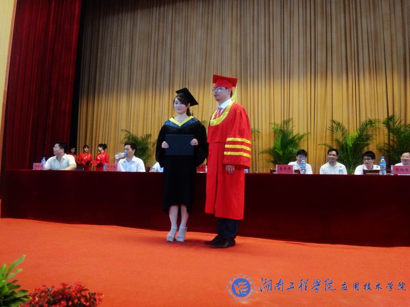 随后,毕业生代表满怀激动地上台领取毕业证书和学位证书,一张张证书和奖状凝结着莘莘学子四载寒暑的辛勤与汗水。毕业生身着学士学位服走上主席台,庄严神圣地接受学位授予。李光中院长为获得学士学位的毕业生颁发学士学位证书,给他们正冠拨苏,握手道贺,并与他们合影留念。学士学位证既是对学子过去的证明,也是他们人生新起点的标志,当李院长将学位帽上的流苏从右拨到左授予学位的那一刻,辛勤与收获、青春与梦想荡漾在每一位学子脸上。