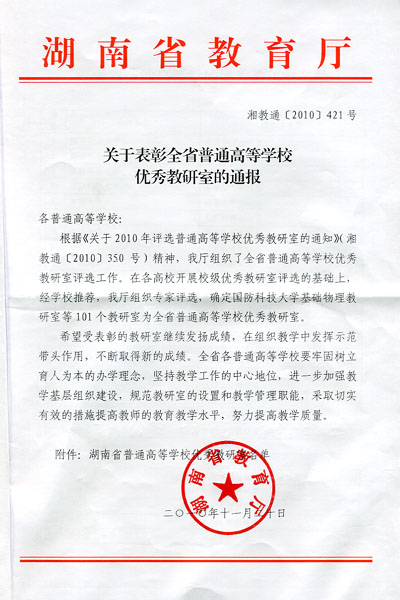 近日,湖南省教育厅发布了《关于表彰全省普通高等学校优秀教研室的通报》(湘教通[2010]421号),beat365官网电气工程及其自动化教研室等101个教研室被评为全省普通高等学校优秀教研室,并受到表彰。