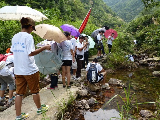 在通往胜仙洞的途中,同学们通过村庄葱绿的田垄,涉过清澈见底的小河,沿着羊肠崎岖的山径攀岩,沿途路过了绕丝潭、洪家山森林公园。