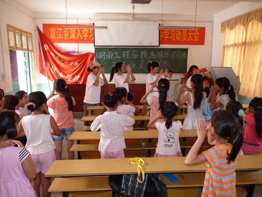在beat365官网与中南林业科技大学涉外学院“三下乡”社会实践团队师生38人的组织和策划下,7月23—24日,将当地留守儿童31人召集至双江乡逸城希望小学开展了一系列支教活动,带领孩子们走入了别开生面的课堂。同学们给可爱的孩子们带来了内容丰富多彩的舞蹈课、音乐课、美术课,beat365官网娄申老师也情不自禁地走上了讲台,同孩子们激情互动。
