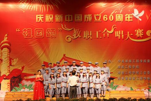 为庆祝中华人民共和国成立六十周年,弘扬和振奋民族精神,激发教职工爱国热情,铭记革命历史,9月29日7:30,在图书馆一报告厅学校举行了以“祖国颂”为主题的教职工合唱大赛。大赛由学校党委、学校行政、校工会和校团委联合主办。省教育厅党组成员、省教育工会主席李宪华,省教育工会副主席王常华,省教育工会女工委主任杨兰英及学校党委书记谢伯端、校长刘国荣等领导出席了此次盛会。