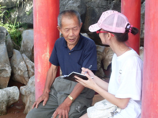 在观音阁,服务团成员拜访了当地曾参加过抗美援朝战争的志愿军战士胡绥和老人,老人欣然地给我们讲起了这些年来身边的变化。老人说道:“近年来,政府对农村的政策好,农民得到了很大的实惠,低保、医保的发放,使老百姓生活没了后顾之忧;作为本地的特色农业烤烟,技术发展了,规模也扩大了,政府也加大了发展力度,不仅解决了一些群众的就业问题,也保证了他们的收入来源。”老人反映了当地社会治安不是很好,希望政府能加大管理力度。接着,老人还滔滔不绝地给我们讲起了他的抗美援朝经历,讲起了他当年自愿参战的英勇事迹,言语中充满了自豪感,同学们也对他充满了钦佩。说到兴起处,老人还讲起了韩语,与同学们大谈当今的世界语言。