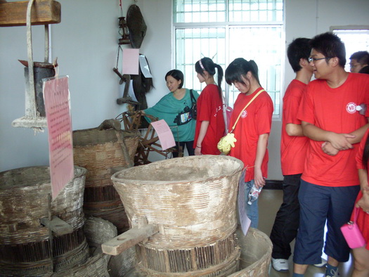 文化综合大楼设有非物质文化遗产展览室、群众文化活动室、图书室等办公室。在石站长的讲解下,成员们了解到,白仓镇的高跷和变脸等艺术水平高超,并受到国内外观众的喜爱。在展览室里,成员们参观了蓑衣、斗笠、纺纱车、织布机等老一代人留下的遗产;在活动室里,成员们看到有群众写的毛笔字和制作的刺绣;在图书馆里,大家看到图书成列有序、分门别类,有医学科技类、农业科技类、社会科学类和文化教育类等,这些无不体现出白仓人民深厚的文化底蕴和强烈的求知欲望。