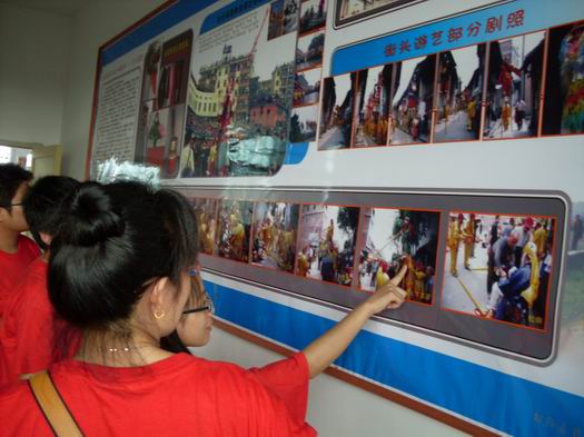 在邵阳县白仓镇的这几天,“建国60周年成就宣讲团”的成员们感受到的不仅是人民物质生活水平提高所带来的喜悦,还有非物质文化的发展。7月8日,在白仓镇人大主席刘楷和文化站站长石九保的带领下,服务团参观了白仓镇文化综合大楼,深刻感受到白仓镇丰富的非物质文化遗产。