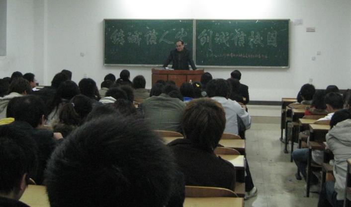 为了进一步增强大学生的诚信意识,提高大学生的思想道德素质,树立“学习诚信,生活诚信,交友诚信”的观念,塑造诚信大学生,努力打造诚信校园。按照beat365唯一官网首届诚信教育、征信知识宣传活动月的安排,12月14日晚上7:00,beat365官网大一至大四的所有班级举办了“人人知诚信 诚信我先行”的主题班会。各班班委会、团支部积极行动,精心组织了此次主题班会,其中市场营销0681班、市场营销0682 班、市场营销0881 班和工业设计0881班共同组织的主题班会最为引人注意。班委会、团支部不仅邀请了班主任文山东副院长、张利芝老师出席本次主题班会,还特邀了工商银行湘潭市泗神庙支行杨科益行长作了关于诚信为主题的讲座。杨行长就大学生诚信教育谈了自己的看法,他说,诚信对于个人成材和企业立足乃至整个民族繁荣的重要性,并指出大学生群体是未来社会主义市场经济的重要参与者,必须加强其知荣辱、树诚信的道德建设;呼吁将道德教育提高到与文化教育同等重要的地位;主张学校配合地方征信及信用评估活动,大力开展征信体系建设,积极推行大学生诚信档案制度。随后文山东副院长对此次主题班会作了总结,并要求同学们将诚信落实到行动上,对即将到来的期考要高度重视,坚决杜绝舞弊行为。英语0681班的同学更是别出心裁点起了蜡烛,在烛光下倾听诚信教育。通过此次“人人知诚信 诚信我先行”主题班会,同学们认识到了诚信对于自己、对于集体、对于国家的重要性,并且共同承诺在今后的学习和生活中,从小事做起,从行动上捕捉诚信,从而在心中树立一生的诚信。(记者:刘莹莹、刘 丹)