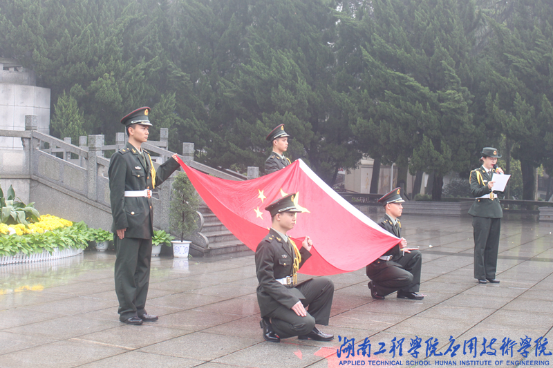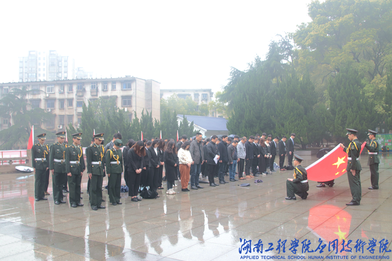 上午7:30,大雨滂沱,全体人员怀着敬仰的心情,迈着沉重的脚步走进烈士陵园。陵园烈士纪念碑前,全体肃立,奏唱国歌,国旗护卫队队员向革命烈士敬献花篮,全体师生默哀致敬。退伍军人代表刘倪萍同学发言,历史不能忘却,要牢记为中国人民和中华民族作出贡献的前辈们,继承先烈遗志,努力奋斗,报效祖国。院长李光中发表讲话指出,无数英雄烈为了社会主义革命和建设事业士抛头颅,洒热血,赴汤蹈火,舍生忘死,换来了国人今天幸福美好的生活,他们是永远不能忘却的纪念。李光中勉励同学们以英烈为榜样,珍惜学习机会,锐意进取,砥砺前行,为祖国的繁荣富强、为实现中华民族伟大复兴的中国梦而努力奋斗。最后,全体人员向烈士纪念碑行三鞠躬礼,绕纪念碑一周。