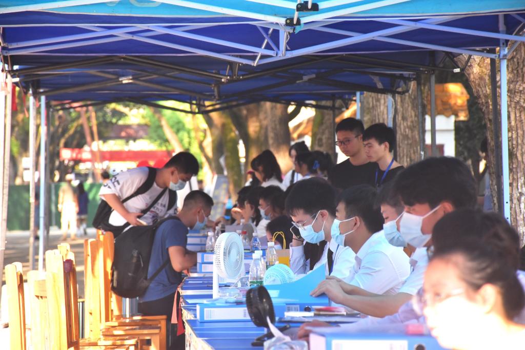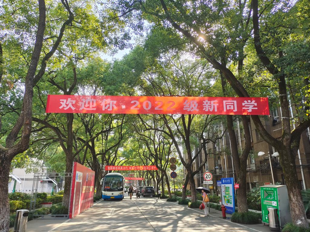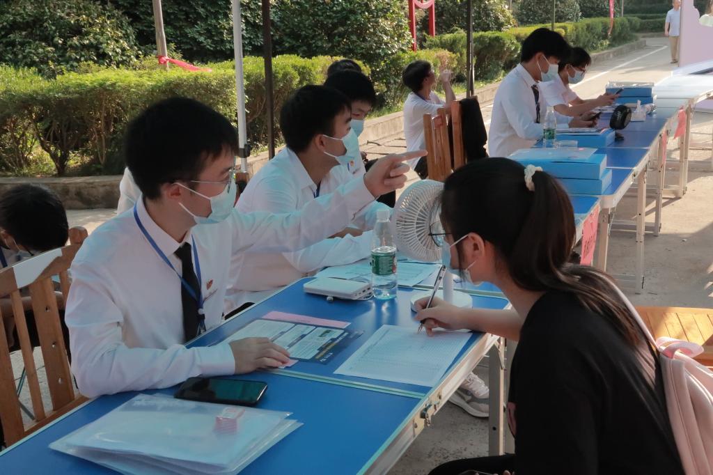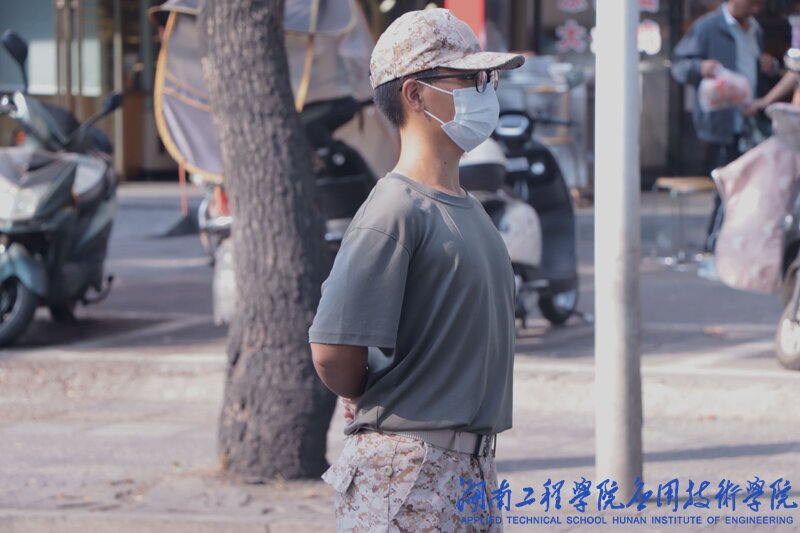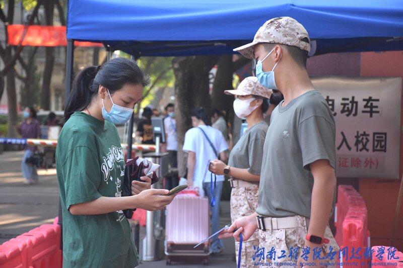 校门口、校园主干道、宿舍门口,一抹抹橄榄绿随处可见,他们挺立在烈日下,为新生提供扫码服务、疏导车辆、维持秩序,成为了校园内一道美丽的风景线。
