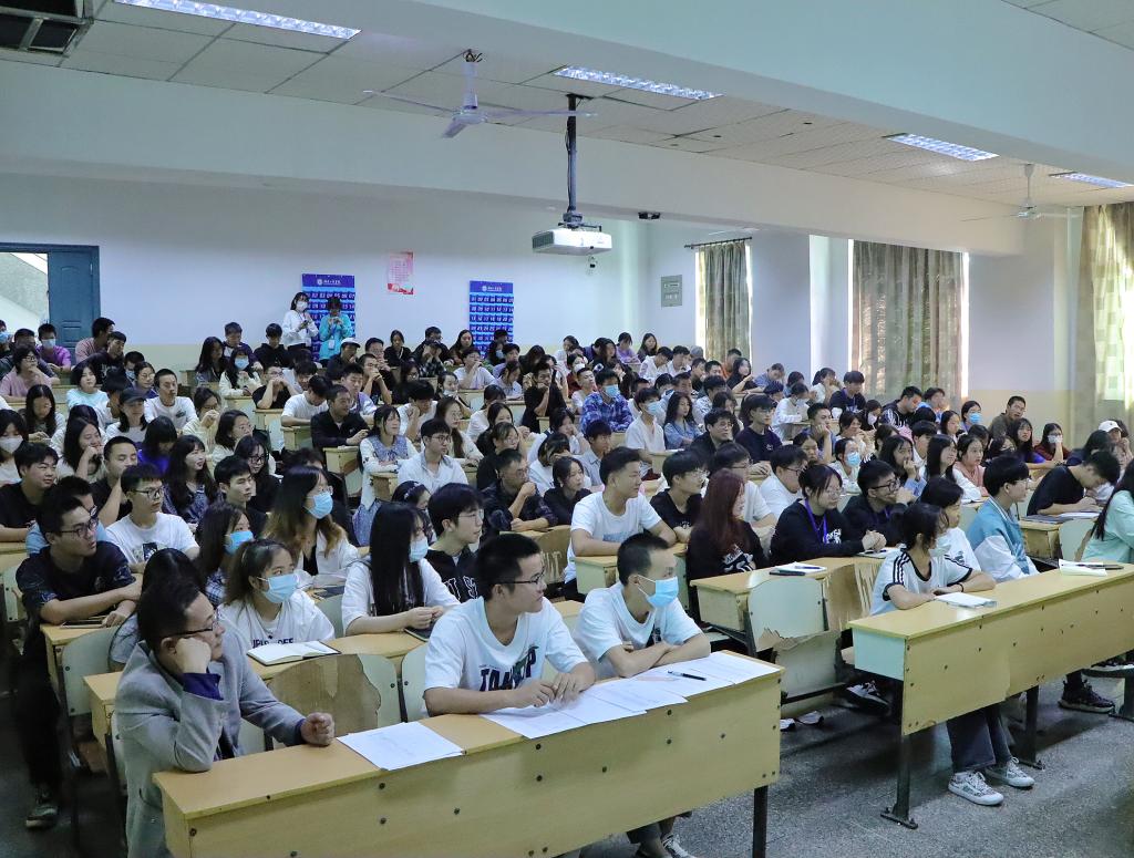 发生火灾怎么办?朱亮从如何正确认识和使用灭火器、快速疏散和快速组织疏散等三个方面进行讲解。首先,正确认识和使用灭火器材。灭火器是最基本的灭火工具,分为ABC灭火器和二氧化碳灭火器,各有优缺点,在使用灭火器时,要坚持“一提二拔三握四压”的方法。消防水带是另一种重要的灭火设备,消防水带既有消防功能,也是重要的逃生工具。其次,快速疏散。面对各种突发火灾等安全事故,生命安全始终是第一位的,因此要做到快速疏散,第一时间离开事故现场。他向同学们讲授了如“三叠八层”湿毛巾掩口鼻法,使用消防水带逃生,及时撤离火宅现场等内容。最后,快速组织疏散。在做好疏散的同时,还要及时做好其他人员的疏散工作。班级学生干部是班级的重要管理者,在紧急时刻,还承担着快速、安全、准确地组织班级学生疏散、逃生的职责。他幽默风趣的讲解赢得同学们阵阵掌声。
