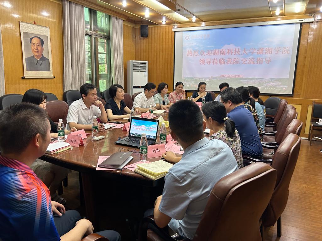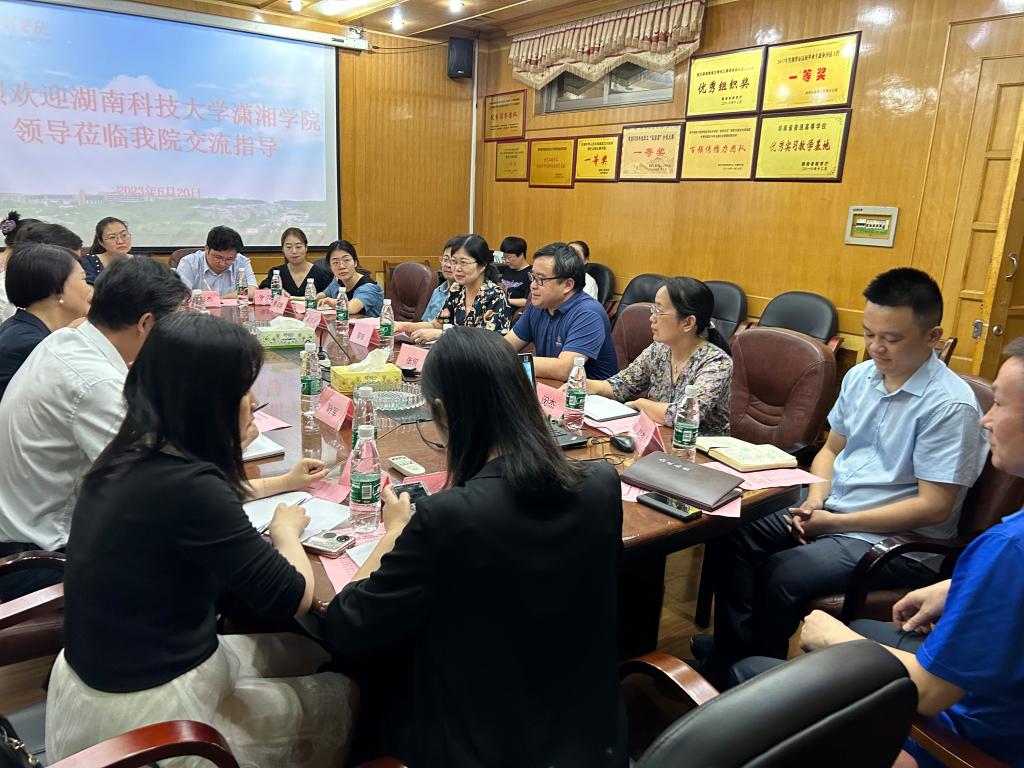 2023年6月19日上午,湖南科技大学潇湘学院院长禹旭才、党委书记廖双红一行来beat365官网调研。beat365官网党委副书记、院长张何、党委书记黎娅,党委副书记陶连洲,副院长闵杰、刘杰,招就办、教务办、学工办等各科室负责人参加调研。黎娅主持会议。