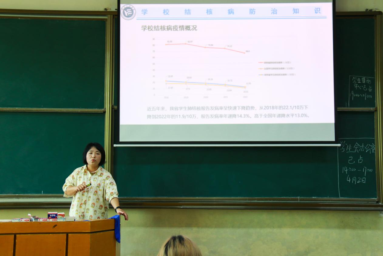 王妮娜以图文并茂的方式,向在场师生详细介绍了结核病的基本知识。她结合当前结核病疫情,阐释了预防和控制结核病的重要性,深入讲解了结核病的预防策略。她提到,预防结核病的关键在于加强个人卫生,保持良好的生活习惯,如定期开窗通风、保持室内清洁、合理饮食等。此外,加强体育锻炼,提高自身免疫力也是预防结核病的有效途径。若出现肺结核可疑症状或被诊断为肺结核后,应当主动向学校报告,不隐瞒病情、不带病上课。