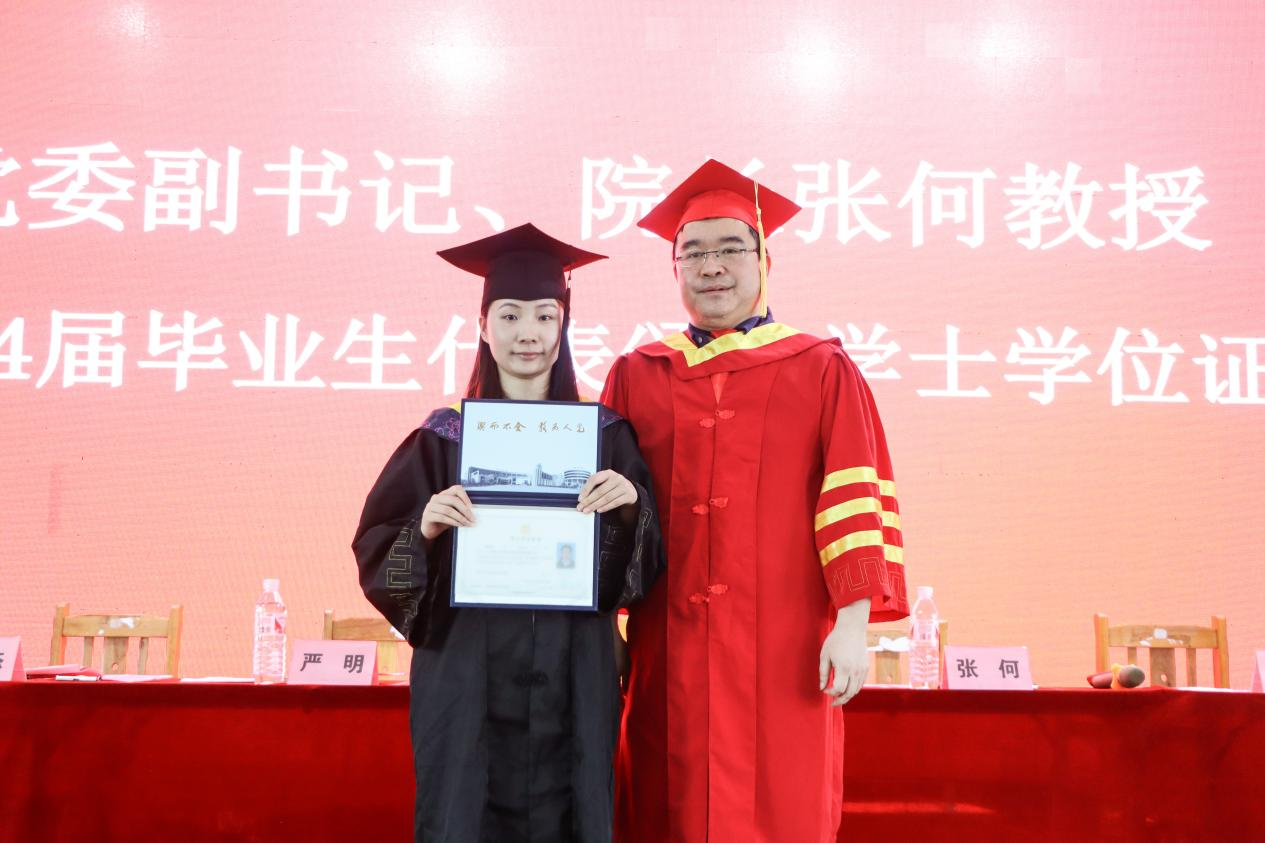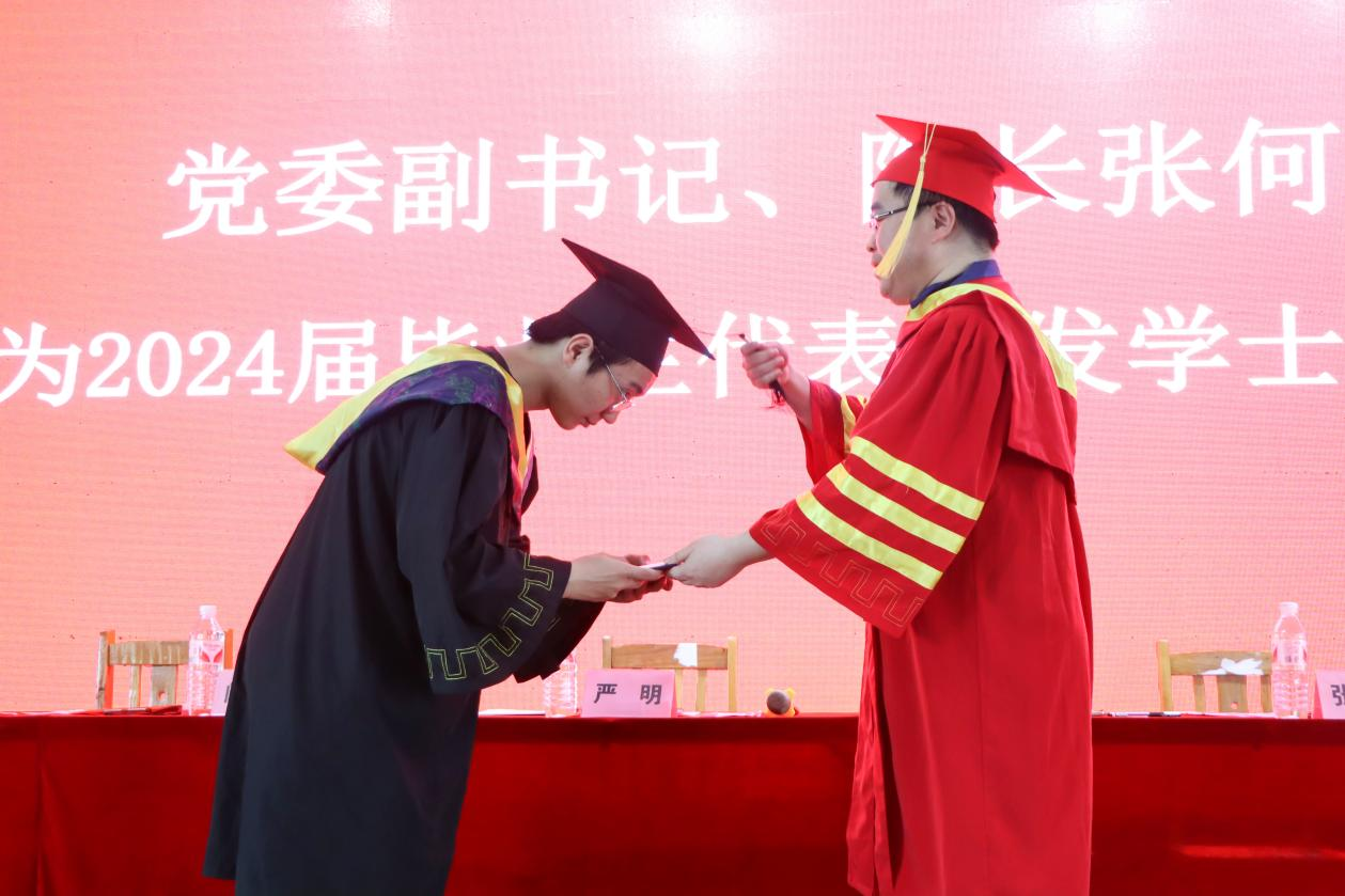 闵杰宣读《关于授予beat365唯一官网2024届毕业生学士学位的决定》后,隆重的颁发学位证书环节正式开始。伴随着激扬的音乐,毕业生代表一一上台,张何为2024届毕业生代表扶正流苏,颁发学位证书,并合影留念。