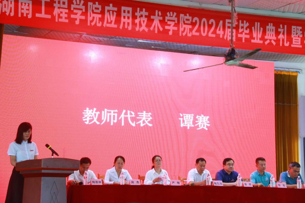 经济学院谭赛作为教师代表发言。她用“选择”“坚持”“感恩”三个词寄语毕业生,希望毕业生保持内心的坚定与勇敢,正确选择人生未来发展方向;勇于克服成长道路上的各种困难,坚持不懈追求发展目标;时刻怀着一颗感恩的心,珍惜身边的人和事。“希望你们在人生的道路上自强不息,在充满了未知与挑战的未来征途上,越走越远,越飞越高”。