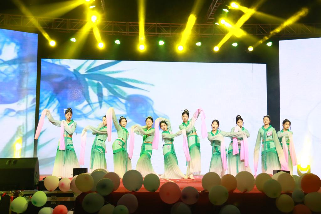 在“国韵流芳,文化传薪”篇章,由中国舞协会、礼仪队、歌曲协会、古风曲艺社选送的文体舞蹈作品,将晚会拉向了高潮。伴随着时而高亢、时而低回旋转的音乐,演员们将中国传统舞蹈、传统服饰文化的独特魅力充分展现。湖南科技大学潇湘学院选送的舞蹈《FULL MOON》,向观众阐释了现代舞的独特魅力。