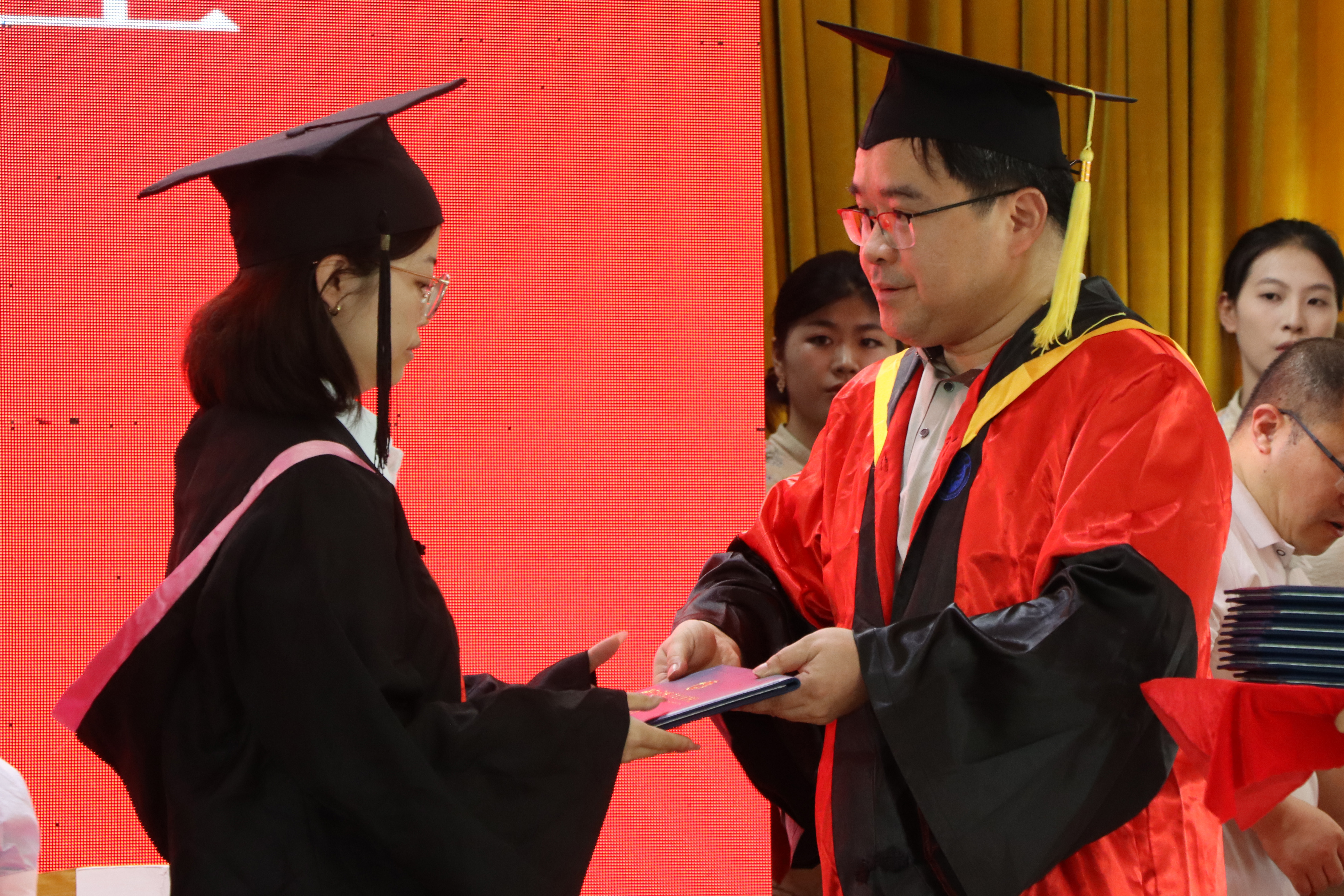 与会领导为获奖毕业生代表颁奖。2025届毕业生身着整齐的学位服,满怀激动之情,接受证书和拨穗。