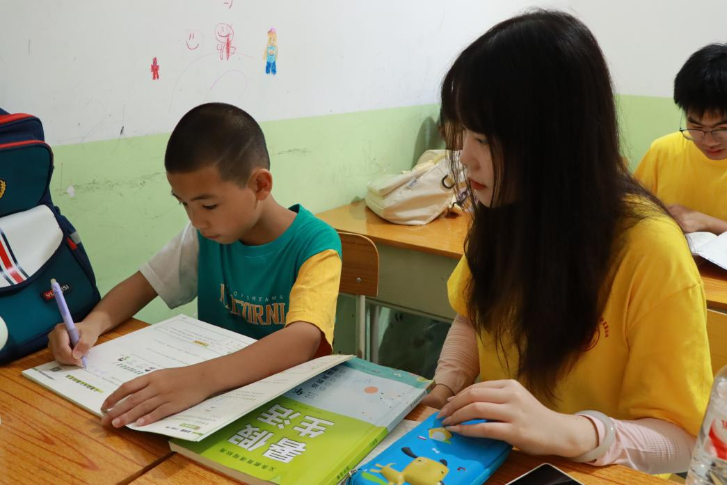 在爱心课堂,志愿者们根据孩子们年级、学习情况的不同,采取一对一帮扶模式,耐心解答孩子们在暑期作业中遇到的难点,用温柔的话语拆解难题,协助他们完成每日习题及预习,巩固基础知识。