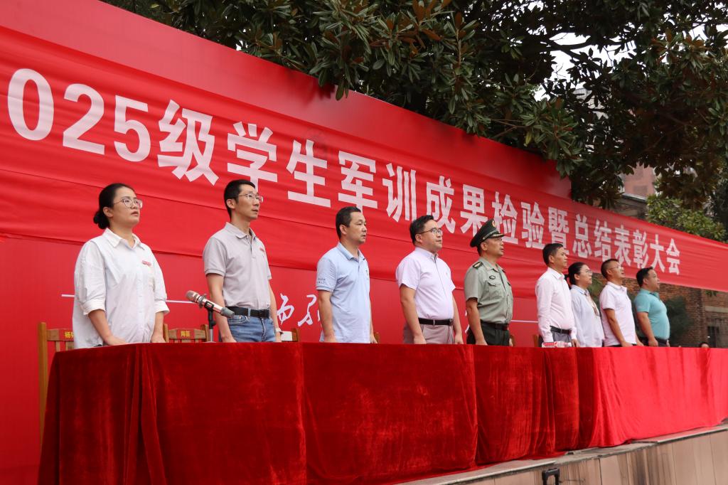 9月29日下午,书院路校区2025级学生军训成果检验暨总结大会在田径场举行。大会由我院党委书记严明主持,校军训团团长、人民武装部部长叶险峰、党委宣传部副部长唐星星,机械工程学院、智能科学与工程学院、商学院和我院领导班子成员及辅导员代表出席大会。